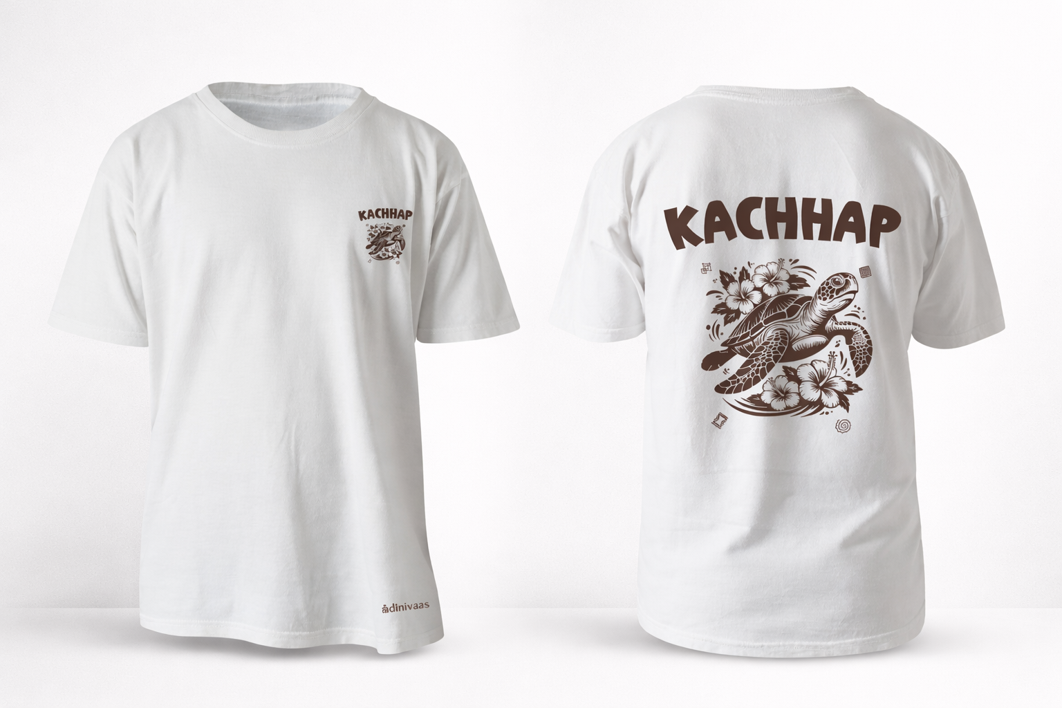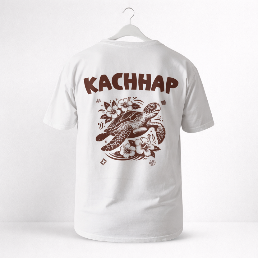 The front showcases a minimal Kachhap insignia with a clean turtle emblem for a subtle everyday look. The back highlights bold Kachhap typography paired with a beautifully illustrated turtle surrounded by aquatic elements, blending cultural symbolism with modern design.