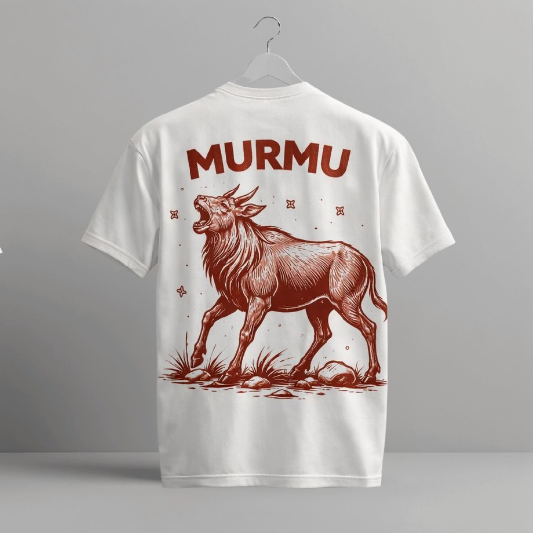 The front showcases a clean, minimal Murmu insignia with a detailed nilgai illustration, while the back makes a bold statement with large “MURMU” typography and a powerful full-art graphic. Designed to balance cultural pride with contemporary streetwear style, this tee is both meaningful and versatile.